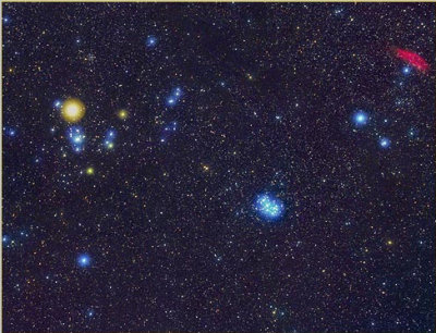 Imagem da constelação do Touro. As estrelas mais brilhantes, normalmente utilizadas para identificar a constelação, surgem bem destacadas. Existem muitos objectos de interesse nesta região do céu. A estrela de cor alaranjada perto do canto superior esquerdo é Aldebaran, um sistema estelar binário, a cerca de 65 anos-luz de distância. A componente principal do sistema (Aldebaran A) é uma estrela gigante vermelha, com uma massa semelhante à do Sol mas um diâmetro entre 40 a 50 vezes maior que o do Sol.Perto do centro da imagem pode observar-se um aglomerado aberto de estrelas, as Plêiades, também conhecido pela designação M45 e mais popularmente como Sete Irmãs ou Sete Estrelo. É um enxame de estrelas relativamente jovem, cerca de 80 milhões de anos, situado a 380 anos-luz. No canto superior da imagem pode ser observada a Nebulosa da Califórnia (NGC 1499) que já pertence à constelação de Perseu.