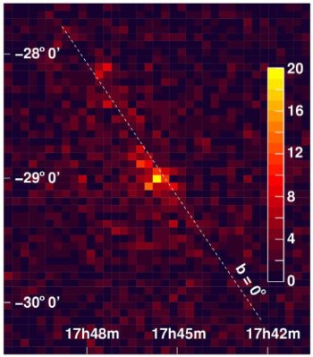 O centro da nossa Galáxia em raios gama de alta energia. A região mais brilhante pode estar associada com o buraco negro de massa elevada Sagittarius A*. As coordenadas são a ascensão recta no eixo das abcissas e a declinação no eixo das ordenadas; a linha na diagonal mostra a localização do plano da galáxia. Crédito: H.E.S.S. collaboration.