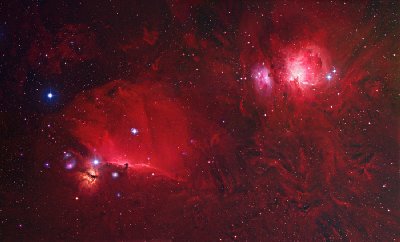Esta magnífica imagem de campo largo obtida por Robert Gendler da região de Orionte, sendo visíveis, em todo o seu esplendor, a nebulosa Cabeça de Cavalo (à esquerda) e a nebulosa de Orionte, M 42 (à direita na imagem). À esquerda da nebulosa Cabeça de Cavalo vê-se ainda a nebulosa da Chama. Esta região é uma região activa de formação de estrelas, constituída por várias nuvens de gás e poeira, estrelas jovens e nebulosas de emissão e reflexão. Esta imagem foi obtida através da combinação de várias imagens resultantes de mais de 20 horas de observação.