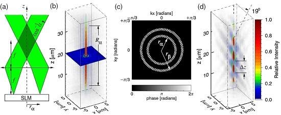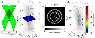 (a) Interseção dos dois lasers; (b) reconstrução volumétrica do feixe resultante; (c) holograma de fase mostrando a correia transportadora de luz; (d) projeção holográfica do feixe que puxa a partícula em direção à sua origem. [Imagem: Ruffner/Grier]